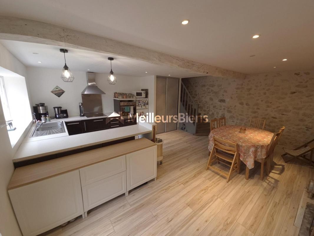 La maison est ancienne et entièrement en pierre apparente (intérieur et extérieur). Elle se compose au rez de chaussée des pièces de vie, spacieuses et ouvertes sur l'extérieur. La cuisine, de 31m², comprend une cheminée ouverte et donne sur un large salon de 24 m². Une mezzanine (de 20m²), aménagée en bureau et chambre d'appoint) permet de compléter les 2 chambres et la salle de bain.