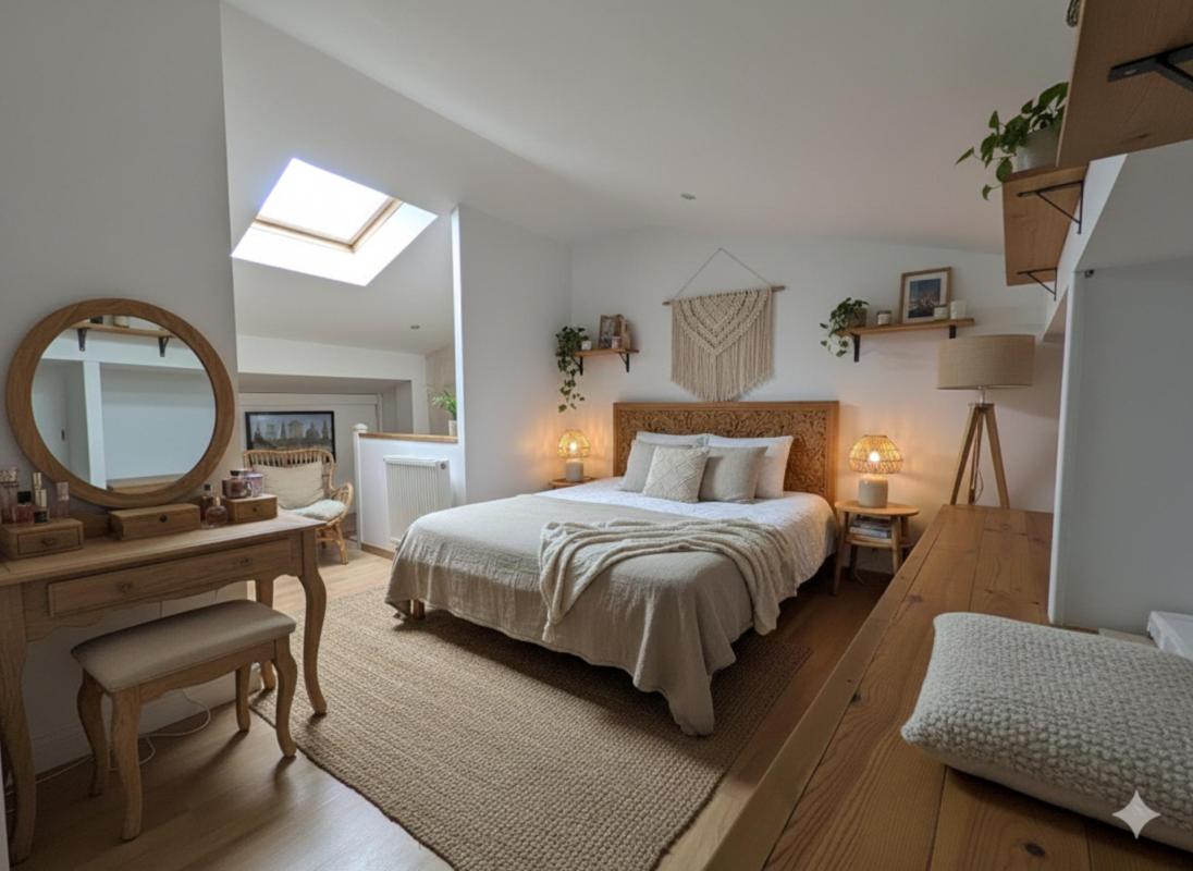 Côté Nuit & Détente : 3 chambres à l'étage, dont une s'ouvrant sur une terrasse privée avec vue sur le clocher.