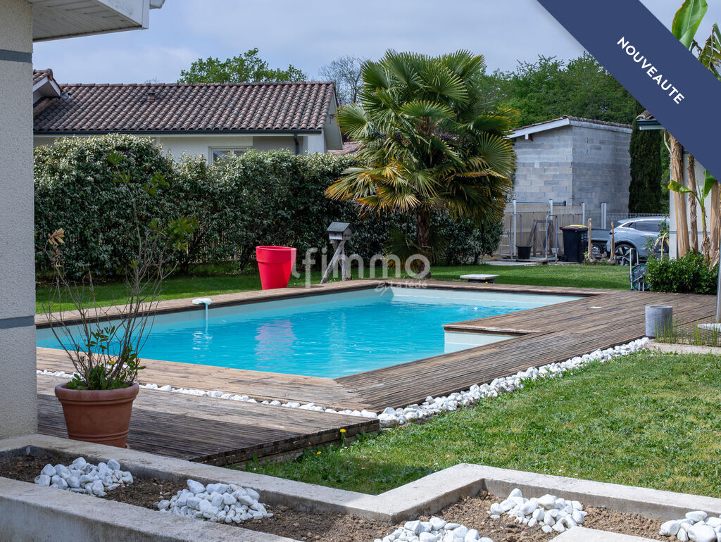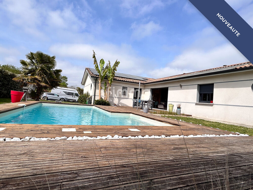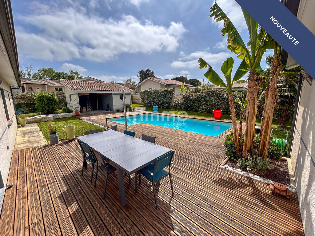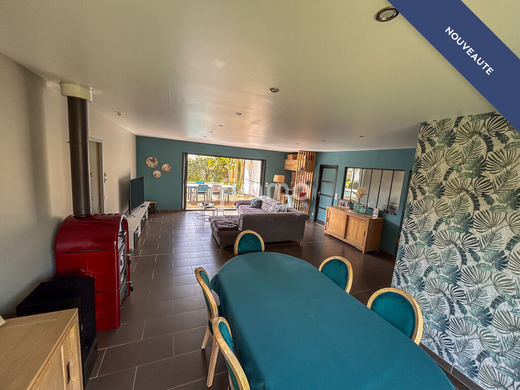 Dès l'entrée, laissez-vous séduire par la pièce de vie de près de 50 m², baignée de lumière grâce à sa double exposition. Sa baie vitrée à galandage ouvre pleinement sur une terrasse en bois et une piscine élégante, créant une parfaite continuité entre intérieur et extérieur.