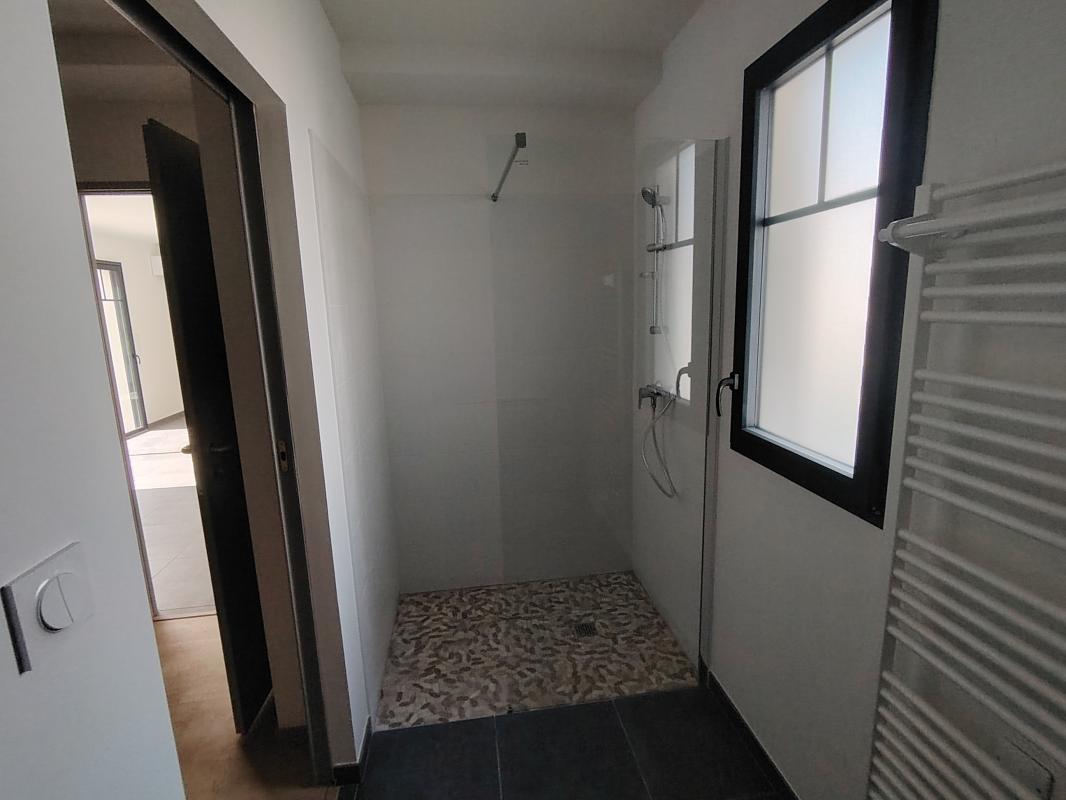 Au rez-de-chaussée, une suite parentale dispose de sa salle d'eau privative et d'un accès direct à la terrasse, créant un espace intime et agréable.