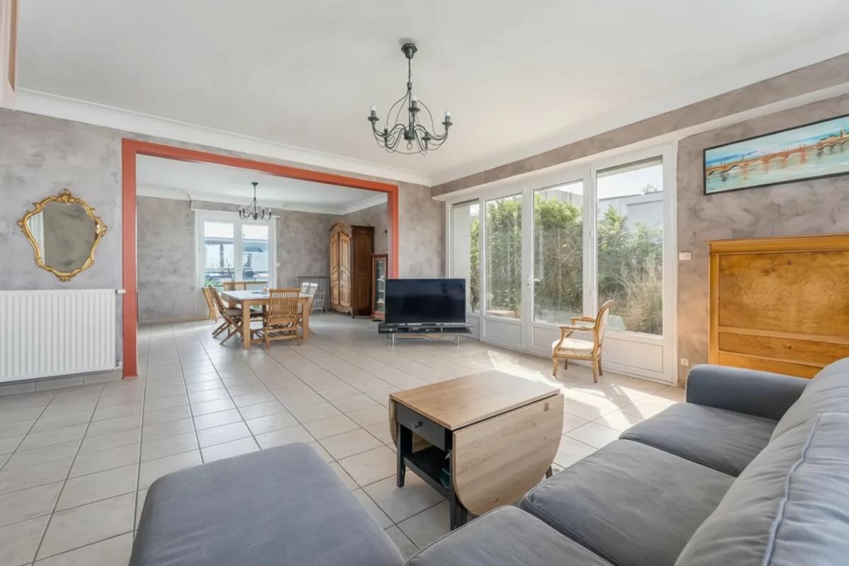 À l'étage, la clarté du grand séjour de plus de 50 m², traversant Est/Ouest, saura vous charmer. Il s'accompagne d'une terrasse enveloppante qui propage la lumière dans chaque coin. S'ajoute à cela une cuisine bien équipée et un couloir menant vers trois chambres supplémentaires, une salle de bain et un WC.