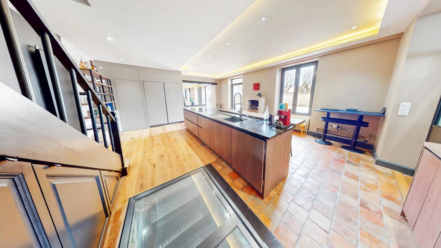 La demeure principale déploie des volumes généreux avec plus de 100 m² de réception. Ce lieu de vie, doté d'un espace salon au plafond cathédrale, est sublimé par son sol d'époque en tomettes, sa majestueuse cheminée en pierre, et ses grandes ouvertures asurant une luminosité exceptionnelle. La cuisine, d'une grande élégance et pleine de caractère, se dévoile avec sa propre cheminée et son accès singulier à la cave par une superbe trappe vitrée motorisée.