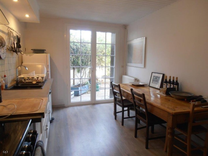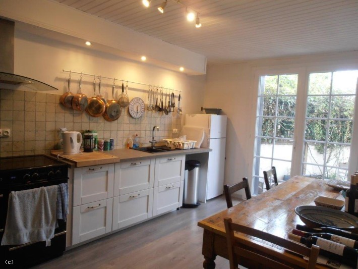 -Cuisine aménagée et équipée (14m²) : parquet flottant, porte-fenêtre