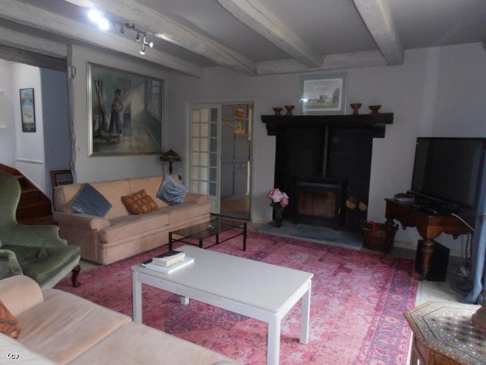 -Salon (26m²) : carrelage, porte-fenêtre, poêle à bois