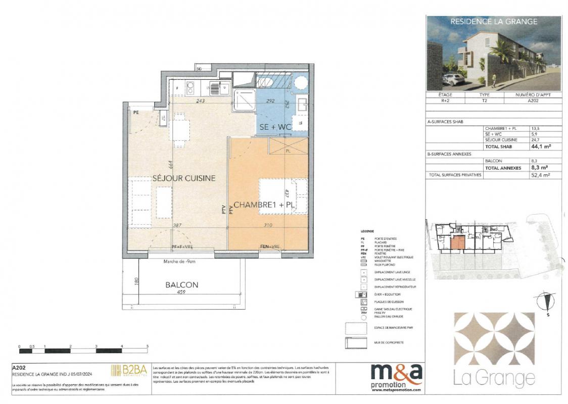 Ce logement se compose d'une spacieuse pièce à vivre de 24,7 m² avec cuisine aménagée et semi-équipée, ouvrant sur une agréable terrasse de 8,3 m².
