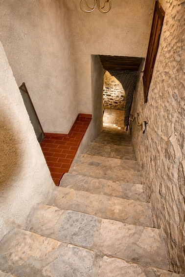 Depuis un angle de la loggia, un escalier en pierre mène aux étages.