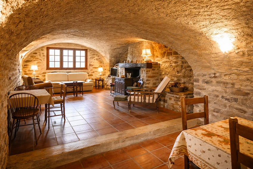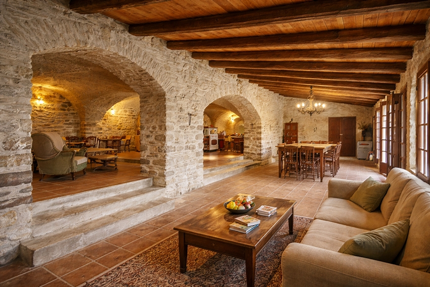 Les murs en pierre, les voûtes et les poutres apparentes confèrent à l'ensemble une atmosphère chaleureuse et authentique.