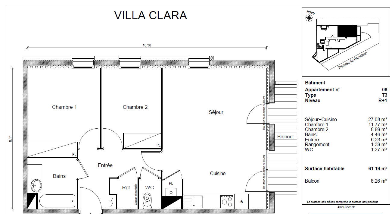 Une entrée, 2 chambres avec placard, d'une salle de bain, d'un WC séparé, d'un séjour cuisine de 27.08 m².