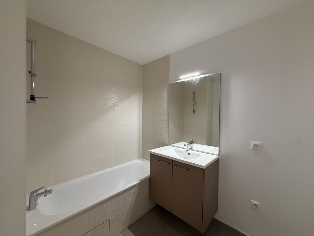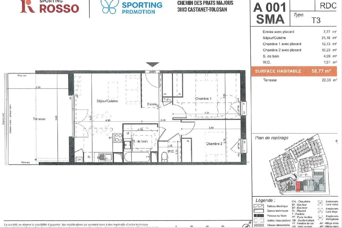 Appartement T3 qui se compose d'une entrée avec placard, d'une cuisine équipée : meubles hauts et bas, plaque et hotte ouverte sur un séjour de 21,18 m², donnant sur une terrasse de 22.33 m². Au coin nuit, deux chambres avec placard de 12.73 m² et 10,23 m². Un WC séparé et une salle de bain de 4,95 m².