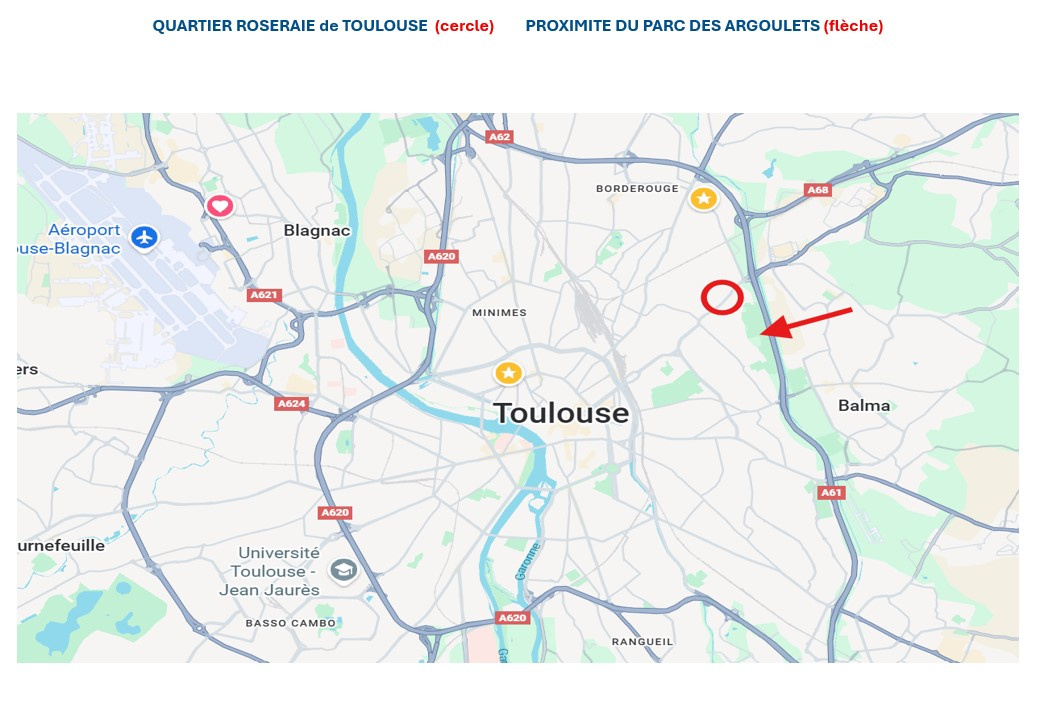 En 2min en vélo ou 15min à pied, vous accéderez à la BASE VERTE des ARGOULETS, une des plus vastes zones de loisirs de l'agglomération Toulousaine, située au sein d'un grand parc accueillant patinoire, piscine, terrains de rugby, de foot, de tennis, pistes cyclables et de running, skate-park, mais aussi la Maison du Rugby et le Centre des Arts du Cirque.