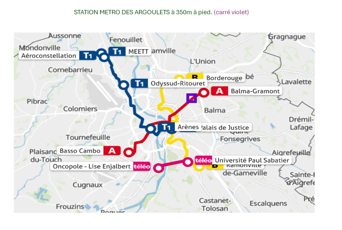 Vous trouverez commerces et services à proximité immédiate. Hypermarché, commerces, et entreprises de la zone d'activité Balma Gramont à 1km. Crèche, écoles, collège et lycée dans le quartier. Stations Argoulets et Roseraie de la ligne A du métro à 300m, mettant à 10 mn la Place du Capitole et des centres d'intérêt culturels, festifs et gastronomiques de la Ville Rose.