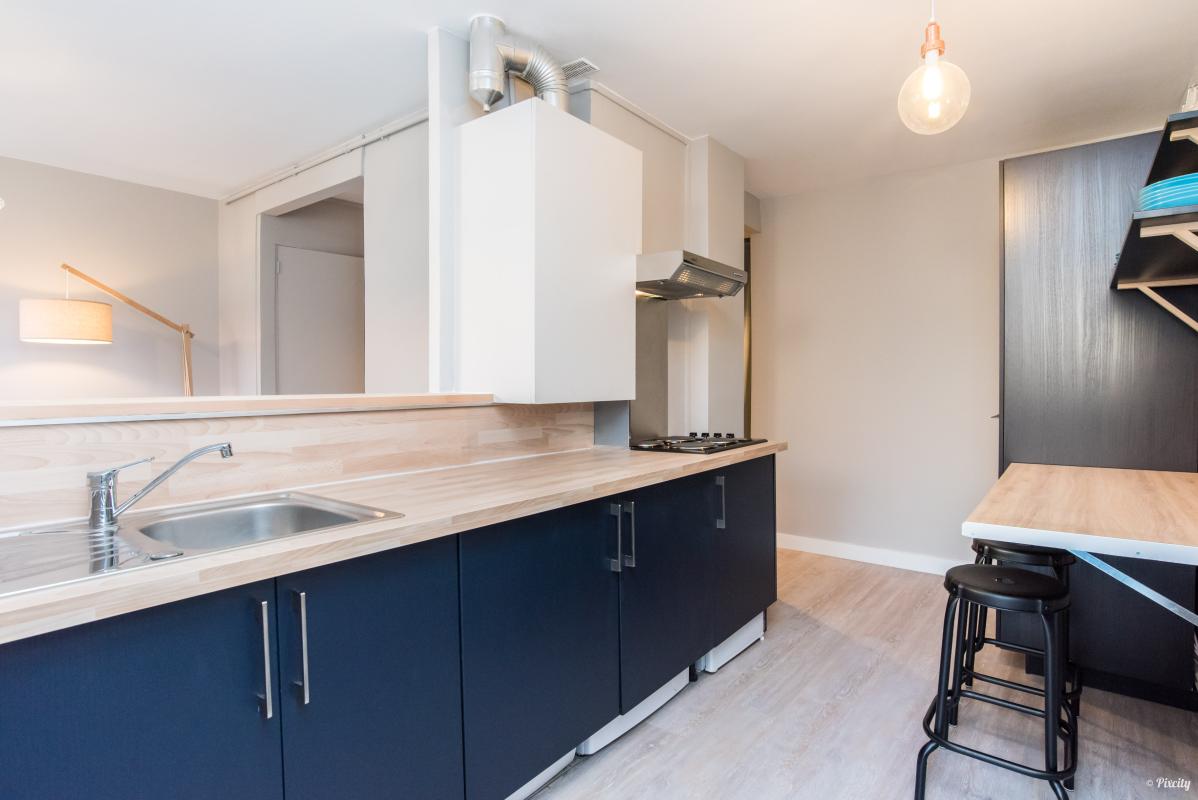 L'appartement, traversant, se compose d'un séjour lumineux et accueillant, d'une cuisine semi-ouverte entièrement équipée, de deux chambres aménagées (lit double, bureau, rangements), ainsi que d'une salle de bain avec baignoire-douche.