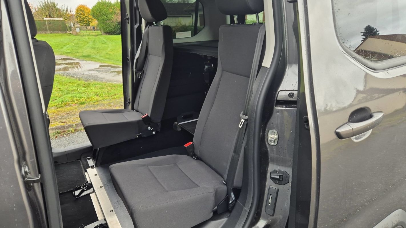 Ludospace aménagé handicap pour transporter 4 personnes accompagnées d'un passager en fauteuil roulant, avec une rampe manuelle en 1 volet repliable en plancher plat (HappyAccess), 2 sièges individuels amovibles en rang 2 et un kit de 4 sangles d'arrimage avec ceinture de sécurité 3 points et enrouleurs avant à blocage électrique.