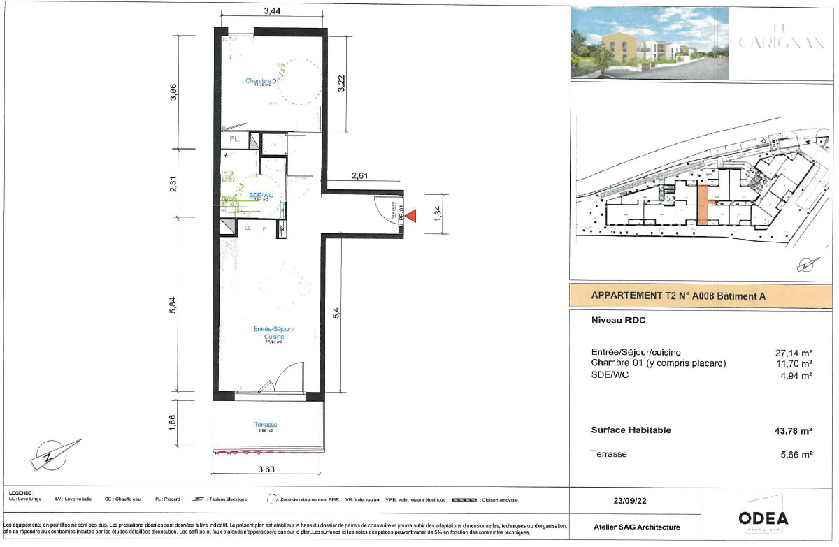 À louer à partir du 25 septembre 2025, un appartement T2 en de 43,78 m² situé en RDC dans une résidence neuve et sécurisée.