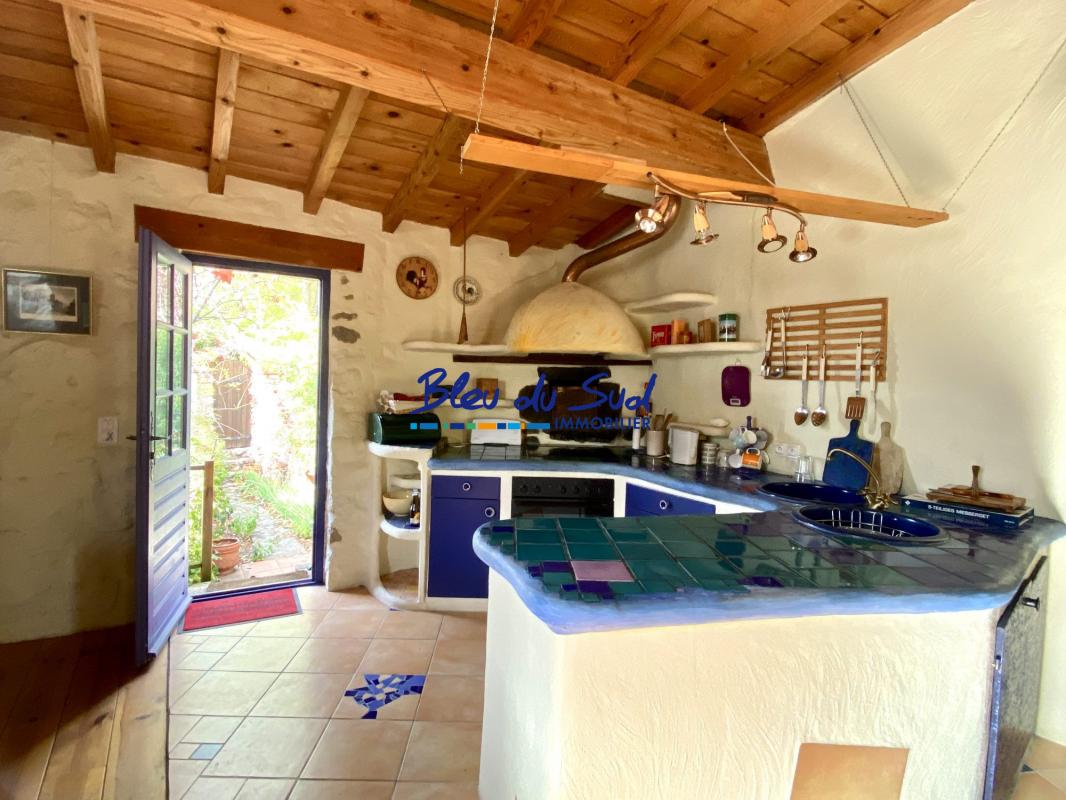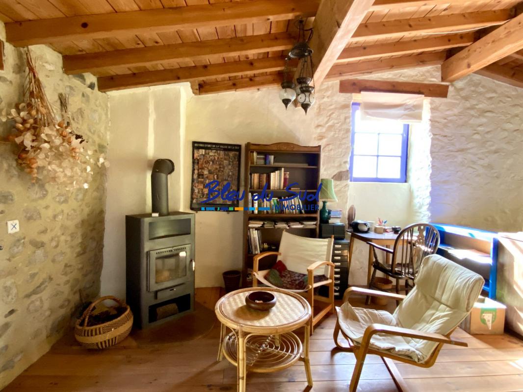Exposée sud-ouest, elle se compose au 1er niveau d' une pièce à vivre avec poêle à bois et d'une cuisine ouverte équipée qui possède un ancien four à pain. La pièce donne accès à une terrasse en bois et à un 1er jardinet.