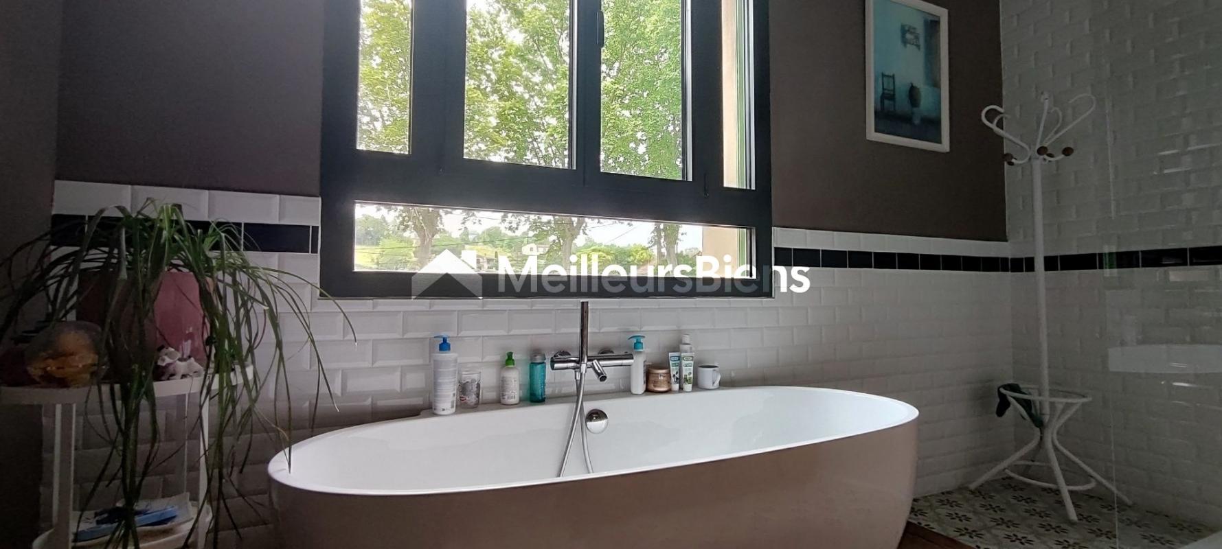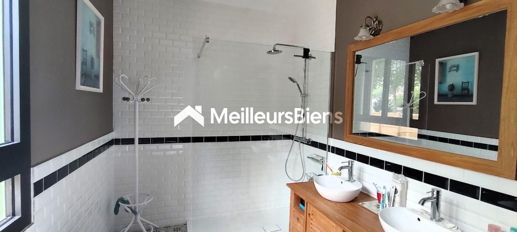 A l'étage on découvre 3 grandes chambres et une grande salle de bain moderne composée d'une baignoire îlot du plus bel effet, avec une douche à l'italienne et meuble double vasque. Un espace bureau pour le télétravail est aussi disponible.