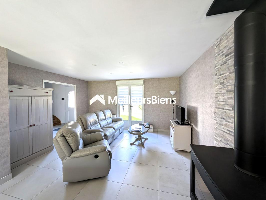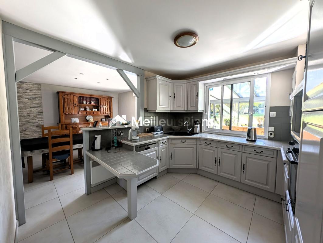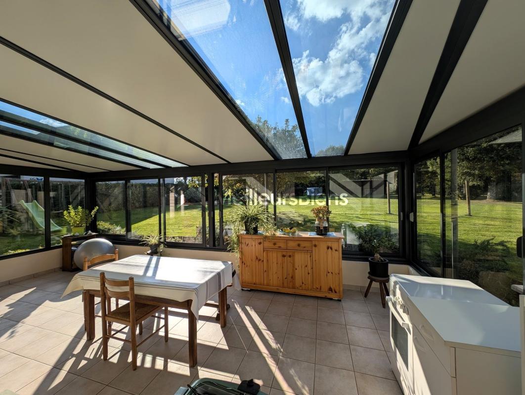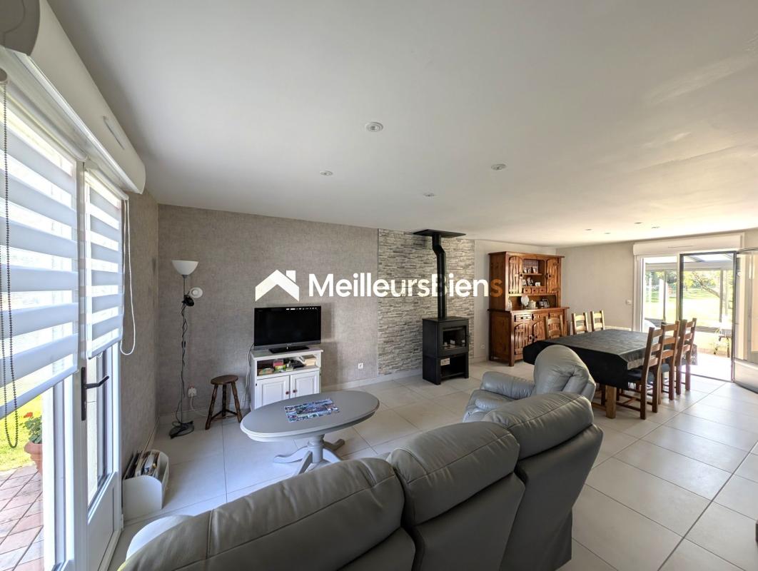 Au rez-de-chaussée se trouve une entrée, une pièce de vie lumineuse avec un poêle à bois, une cuisine ouverte entièrement aménagée et équipée. Une grande véranda récente de 22 m² avec vue sur le jardin ,une chambre avec accès de plain-pied, une salle d'eau avec WC. Un garage attenant, accessible directement depuis la maison.