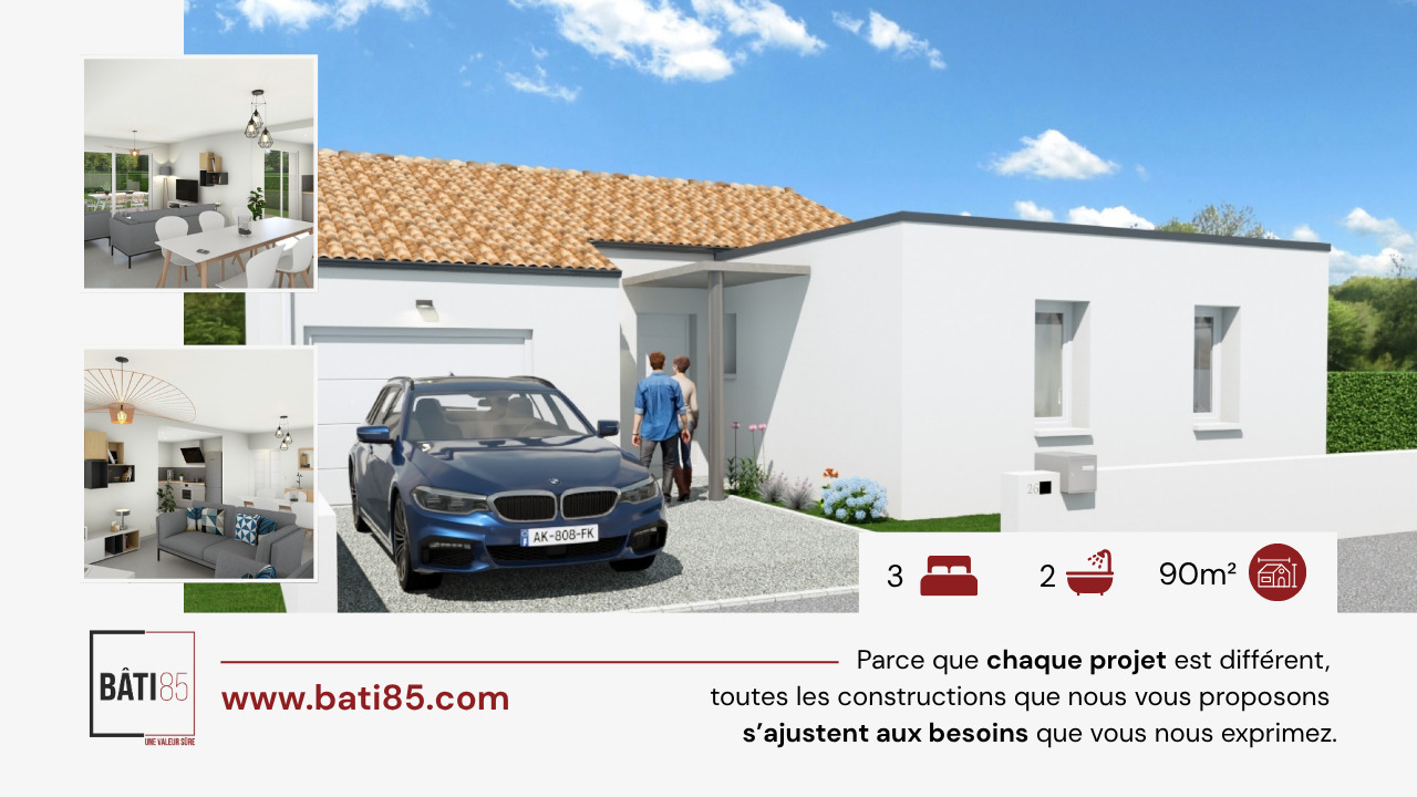 Laissez-vous séduire par cette maison neuve à construire, proposée par BÂTI 85, constructeur de confiance dans la région depuis plus de 40 ans. Implantée sur un terrain à sélectionner selon vos préférences (étude personnalisée), cette maison allie confort moderne, fonctionnalité et performance énergétique.