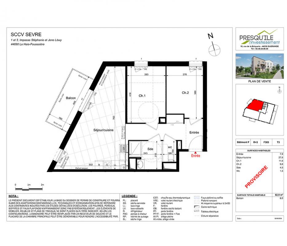 C'est un appartement de type T3 (F3 / 3 pièces / 2 chambres), d'une surface habitable totale de 62.90 m², situé au 3ème étage, exposé Ouest et destiné aux différents projets : investissement locatif, résidence principale et résidence secondaire. Cet appartement est éligible au dispositif Droit Commun pour habiter ou investir à La Haie-Fouassière.