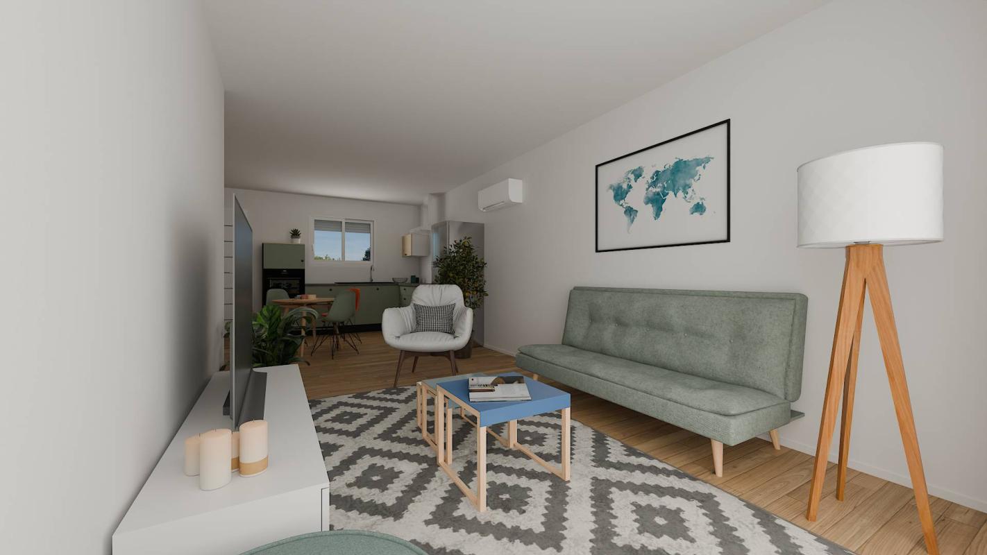Belle pièce de vie avec cuisine ouverte, idéale pour recevoir