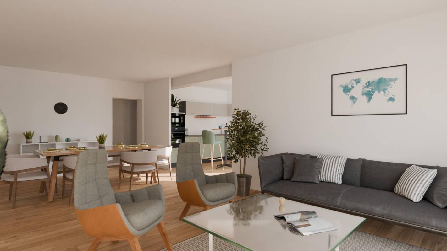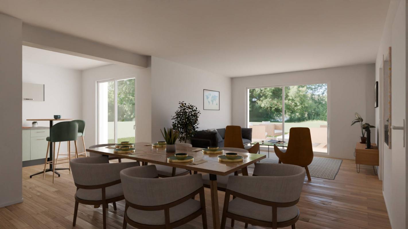 Maison moderne avec pièce de vie de 41 m² lumineuse et cuisine ouverte.