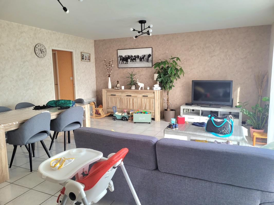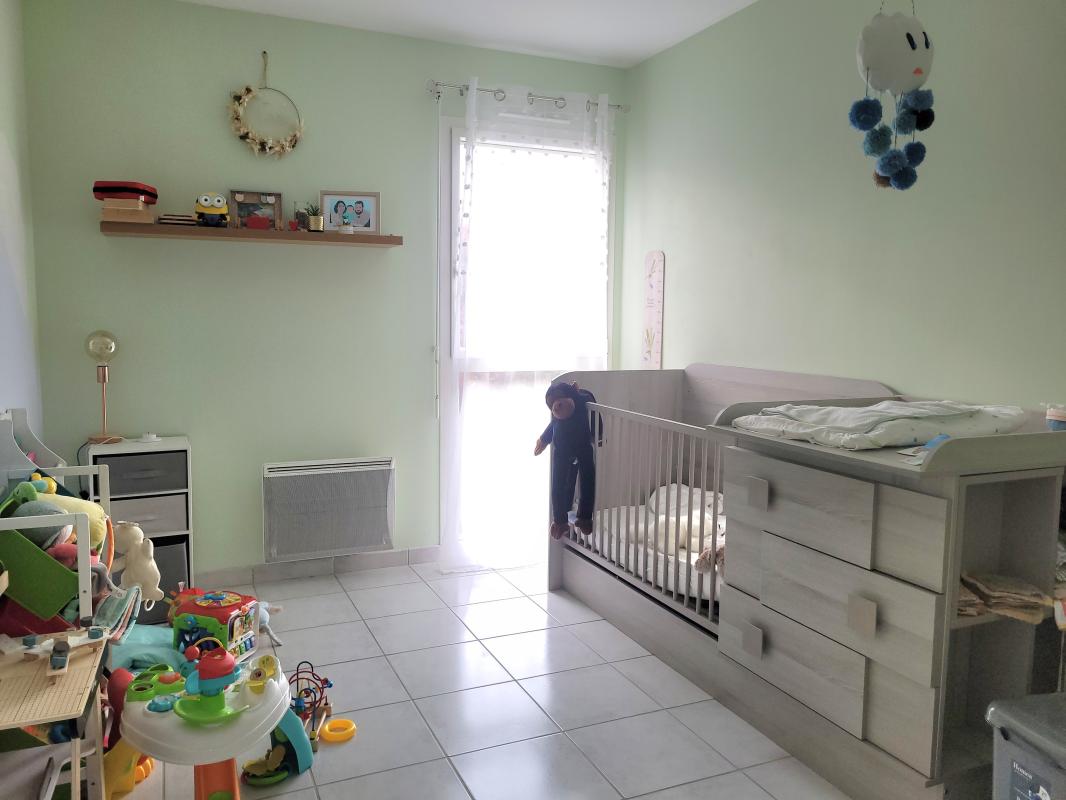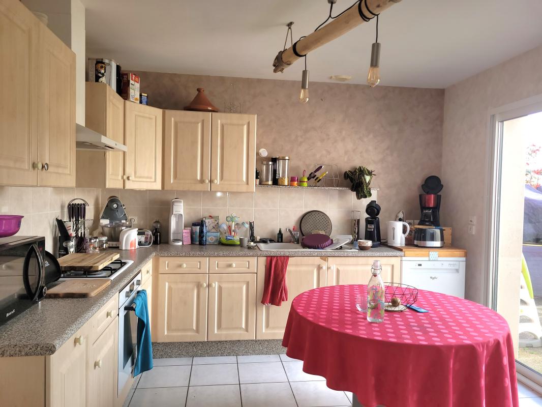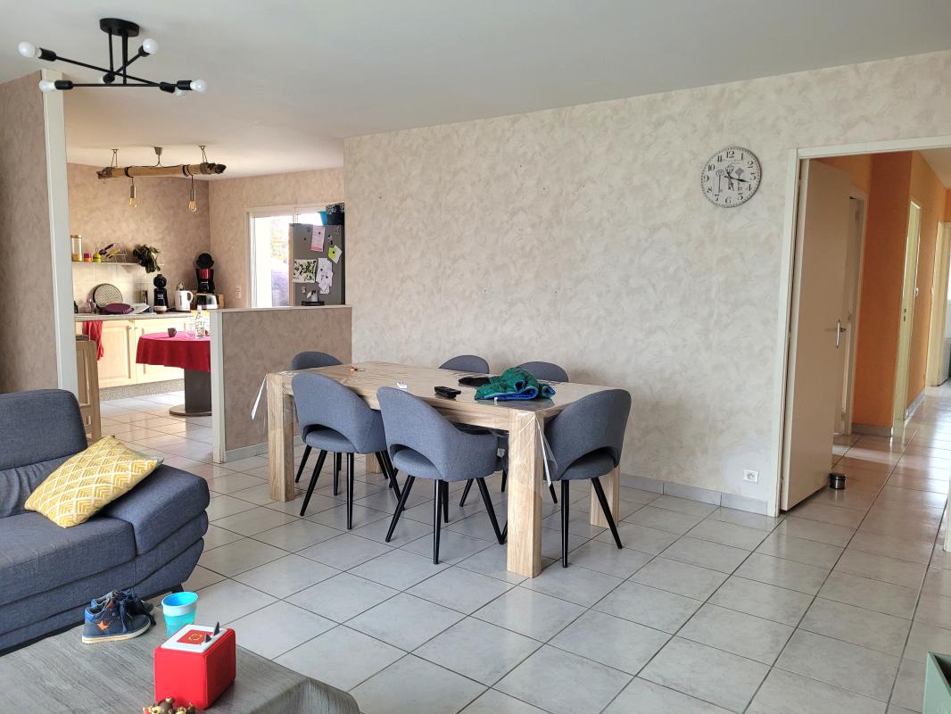 Maison de plain pied année 2005 comprenant séjour-salon, cuisine aménagée et équipée (plaque et hotte), WC, 3 chambres, salle de bains.