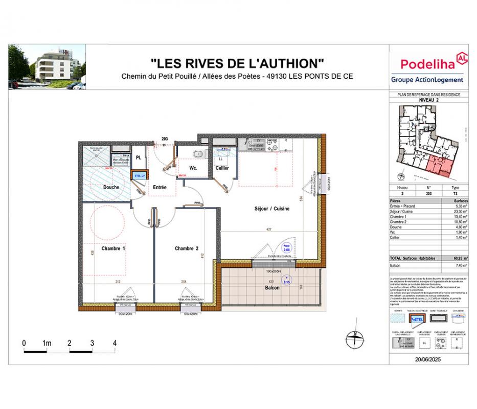 C'est un appartement de type T3 (F3 / 3 pièces / 2 chambres), d'une surface habitable totale de 60.95 m², situé au 2ème étage, exposé Nord-Est