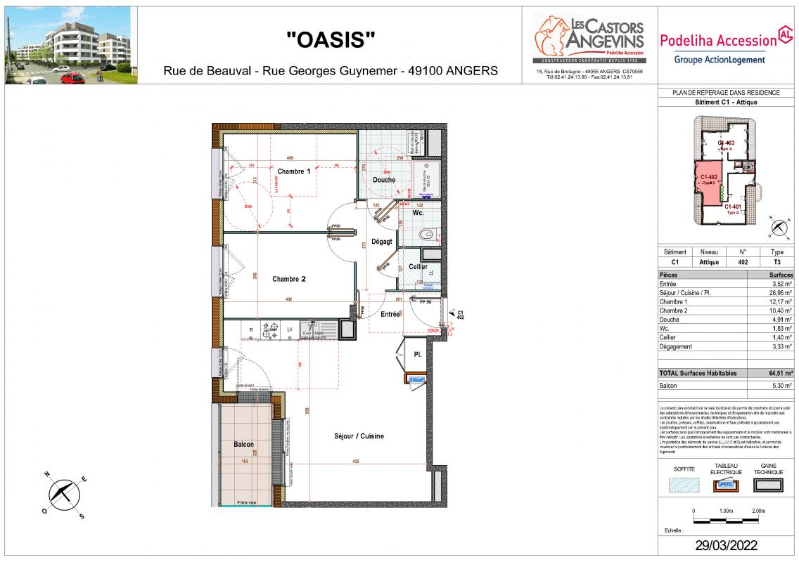 C'est un appartement de type T3 (F3 / 3 pièces / 2 chambres), d'une surface habitable totale de 64.51 m², situé au 4ème étage, exposé Sud-Est.