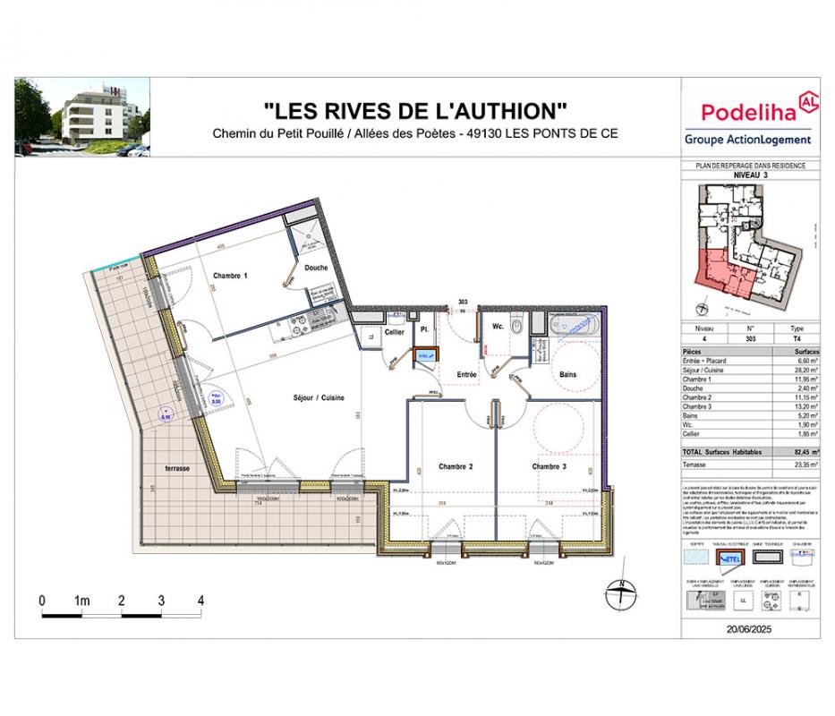 C'est un appartement de type T4 (F4 / 4 pièces / 3 chambres), d'une surface habitable totale de 82.45 m², situé au 3ème étage, exposé Sud