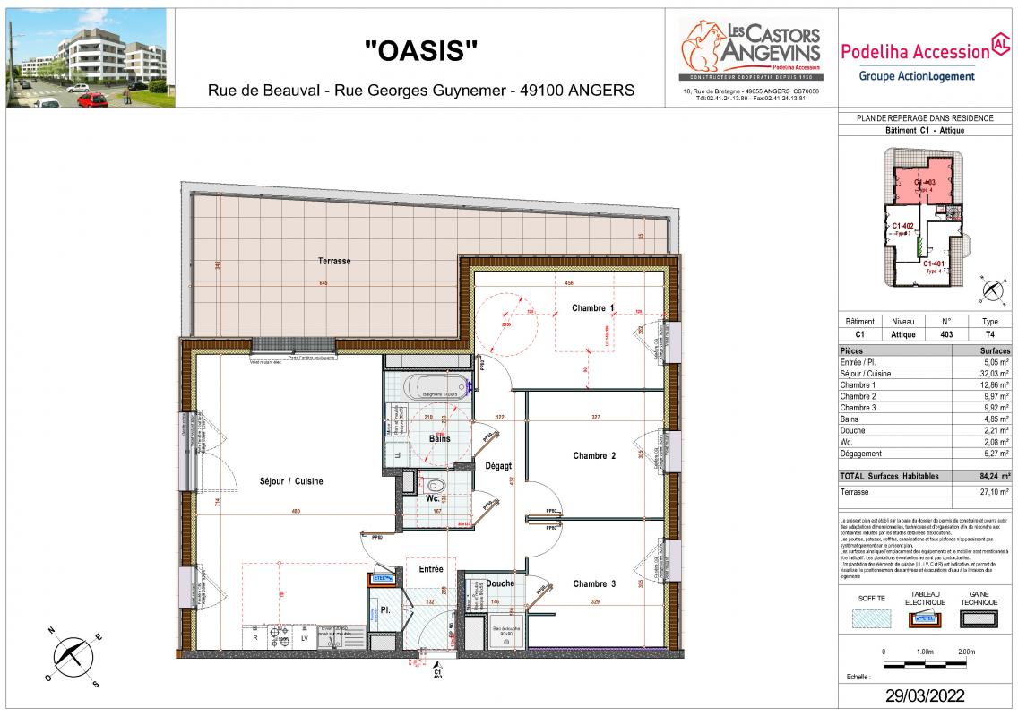 C'est un appartement de type T4 (F4 / 4 pièces / 3 chambres), d'une surface habitable totale de 84.24 m², situé au 4ème étage, exposé Nord-Est.