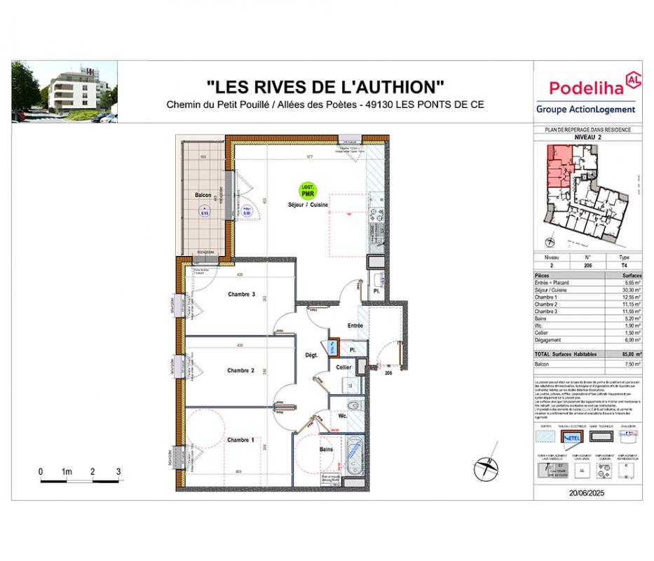 C'est un appartement de type T4 (F4 / 4 pièces / 3 chambres), d'une surface habitable totale de 85.80 m², situé au 2ème étage, exposé Sud-Ouest