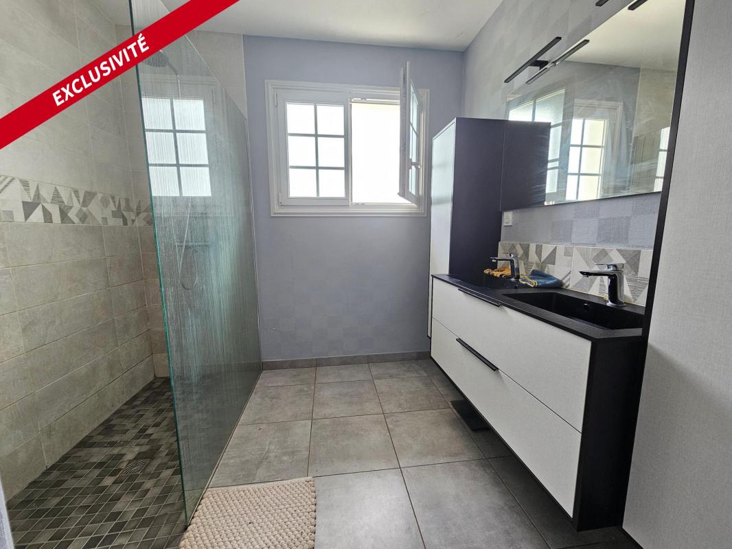 Au rez-de-chaussée: un hall d'entrée avec placard dessert une cuisine aménagée et équipée avec espace repas, ouverte sur un séjour-salon très lumineux de 60m². Vous trouverez également un bureau (ou chambre selon vos besoins), trois autres chambres avec rangements intégrés, une salle d'eau ainsi qu'un WC indépendant.