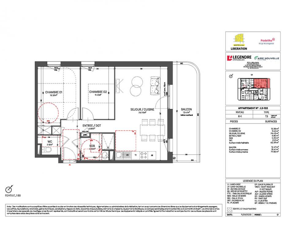 C'est un appartement de type T3 (F3 / 3 pièces / 2 chambres), d'une surface habitable totale de 62.39 m²