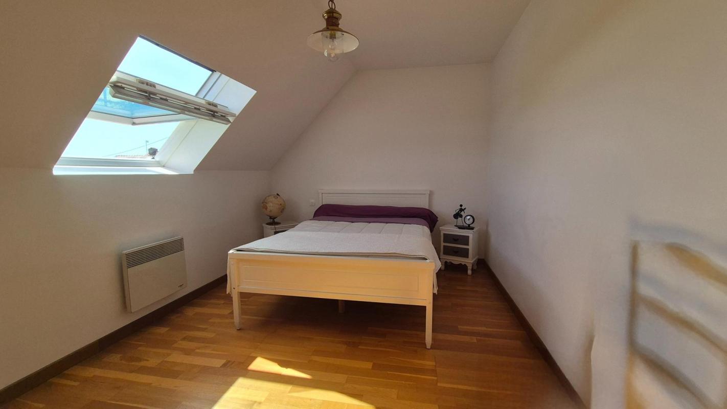 À l'étage : un grand palier dessert trois chambres dont une très grande, ainsi qu'une seconde salle de bain et des WC.