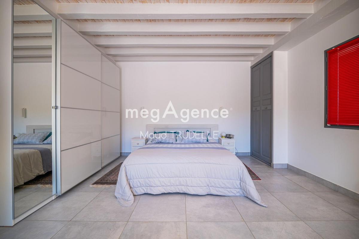Sur plus de 200 m², la maison principale dispose d'une belle pièce de vie avec cuisine ouverte, 5 chambres, 2 salles de bains, 2 petits salons et une salle de sport en mezzanine sur la piscine intérieure.