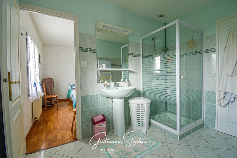 Deux chambres confortables donnent sur une salle d'eau et des WC séparés, tandis que la suite parentale dispose de sa propre salle de bain et douche. À l'extérieur, un garage spacieux de 90 m² accueille plusieurs voitures et un camping-car, avec cave à vin et atelier.