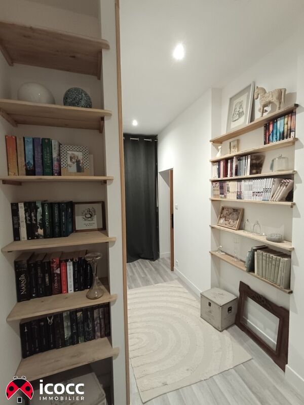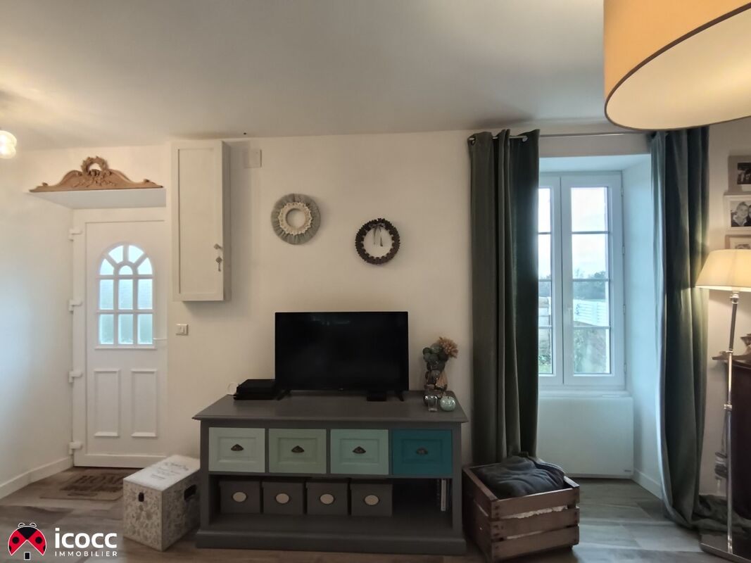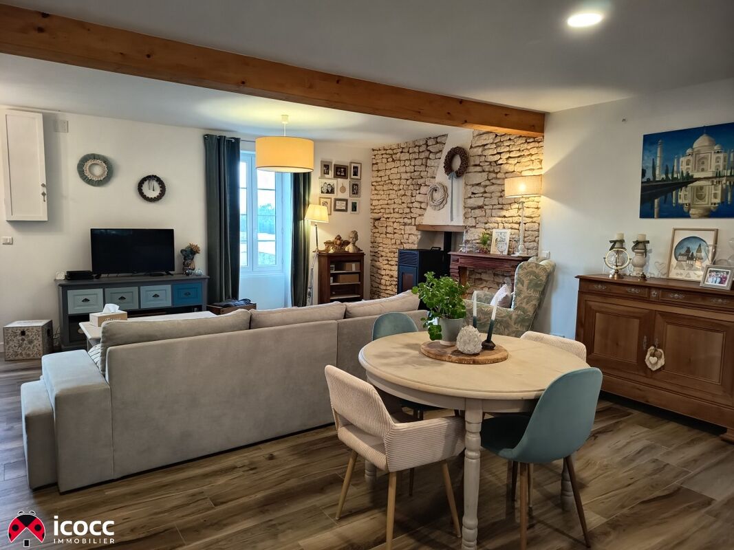 La maison s'ouvre sur un séjour spacieux et lumineux, véritable coeur de la maison, sublimé par des murs en pierre apparente, créant une atmosphère douce, conviviale et élégante. L'espace de vie se prolonge vers une cuisine équipée, dotée d'un plan de travail en bois, alliant charme et fonctionnalité.