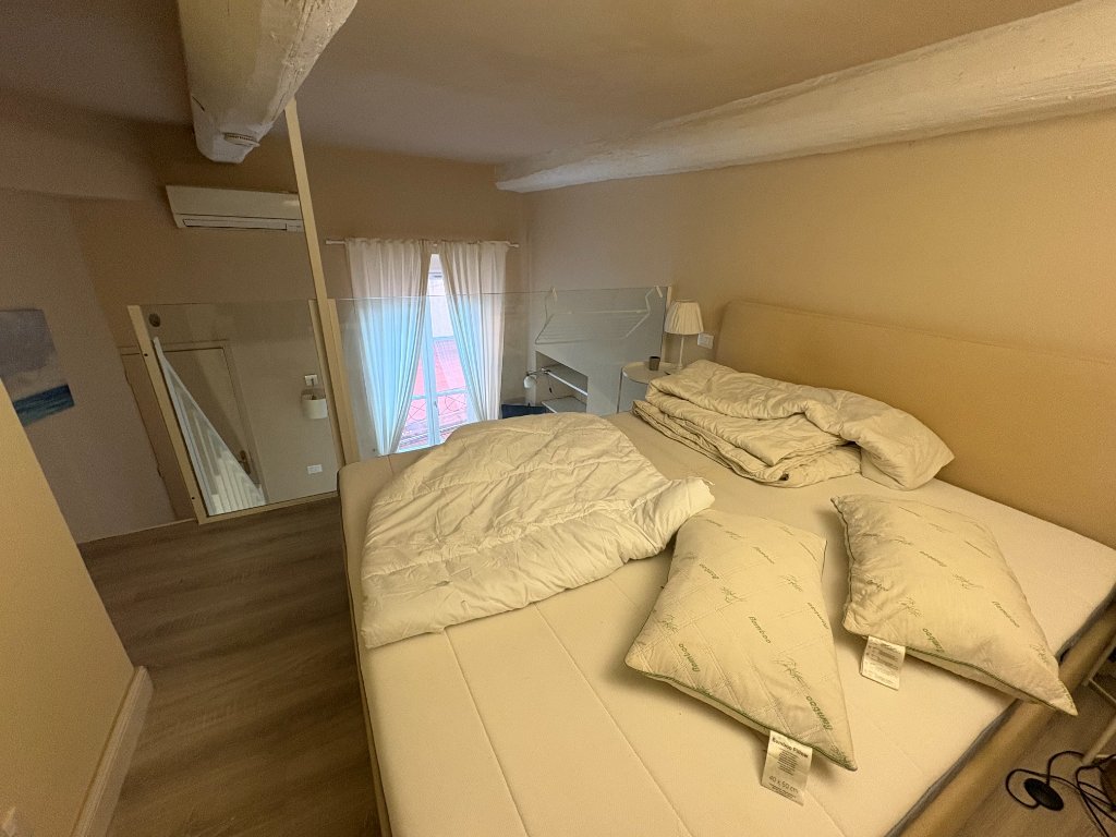 Studio en duplex à louer, meublé. En plein centre-ville, la mezzanine comprend la chambre, tandis qu'au rez-de-chaussée se trouvent l'espace salon et la cuisine.