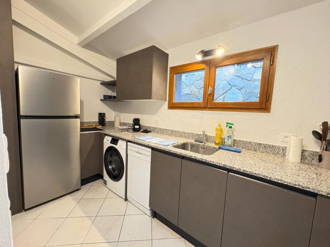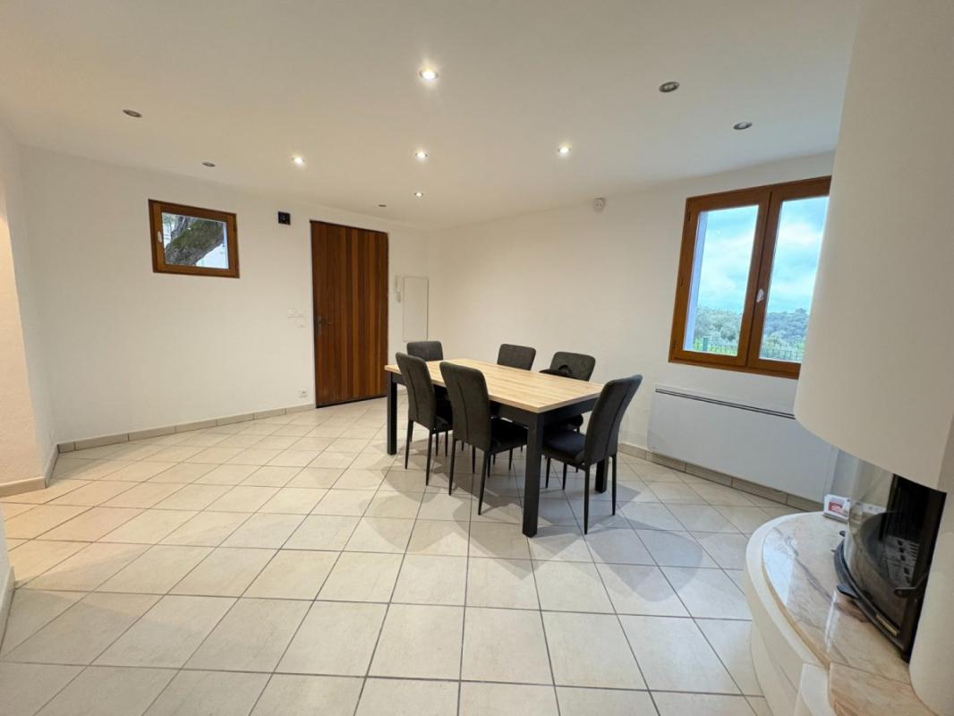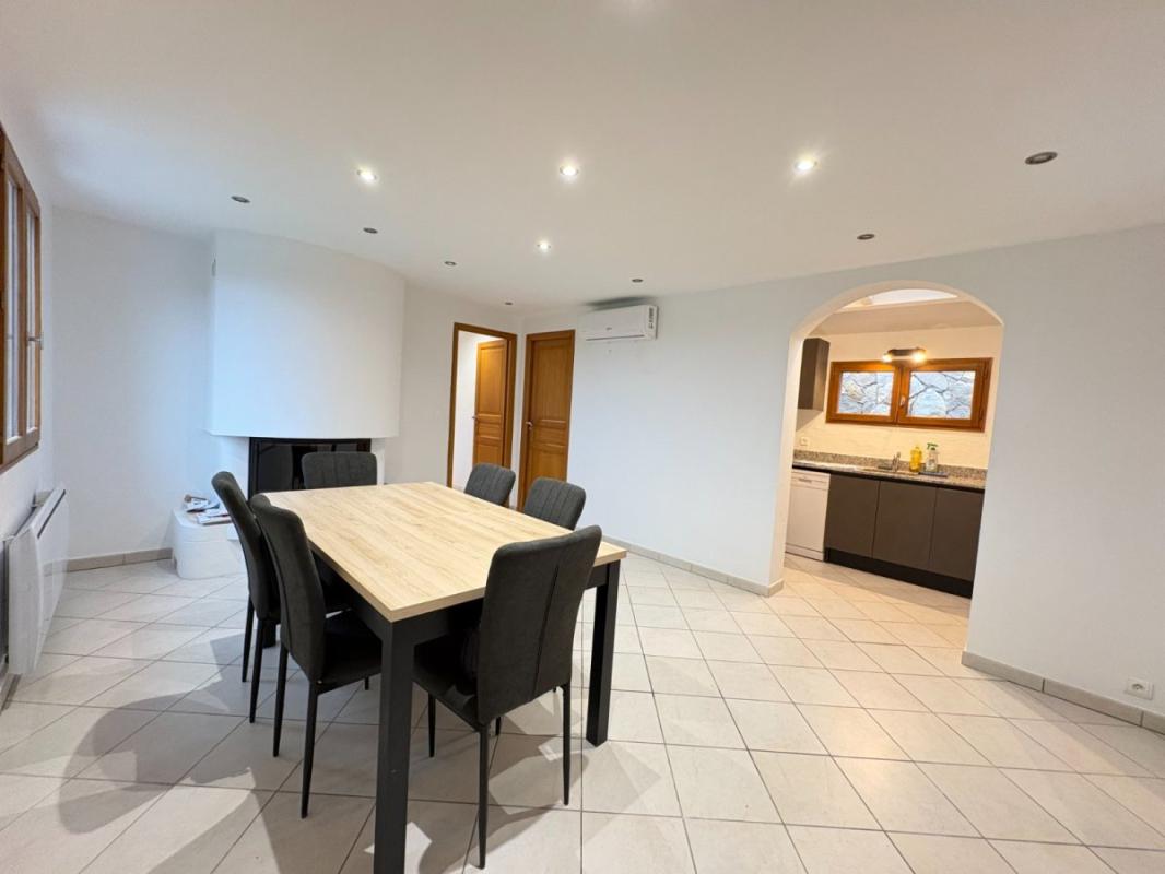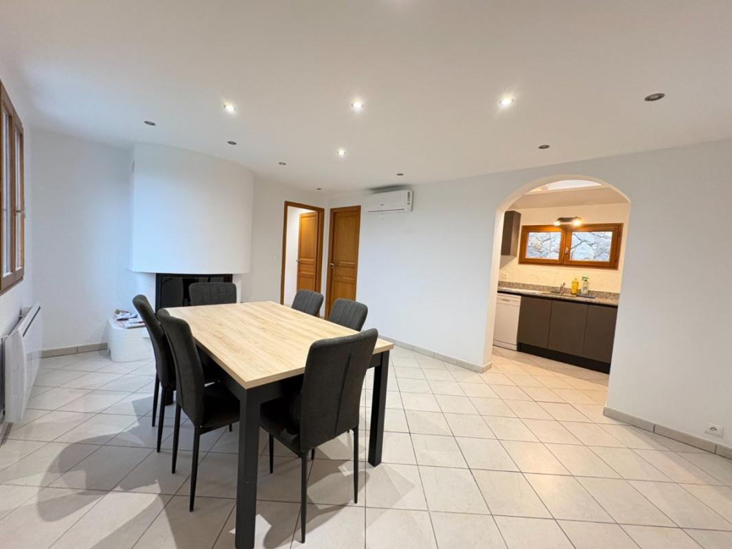 Maison de 62 m² comprenant une entrée, un salon avec cheminée, ainsi qu'une cuisine équipée et aménagée.