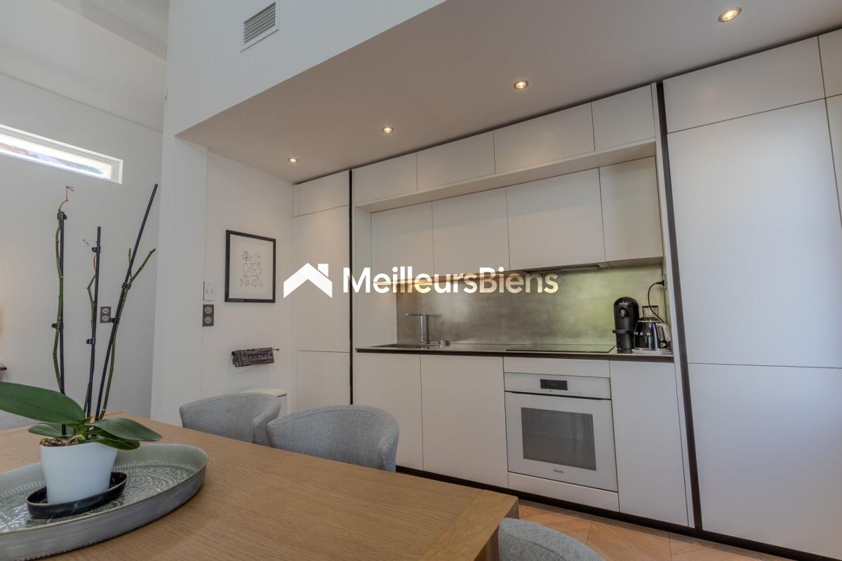 La cuisine équipée (de marque Italienne) s'ouvre sur un espace séjour très lumineux et élégant, agrémenté d'une cheminée.