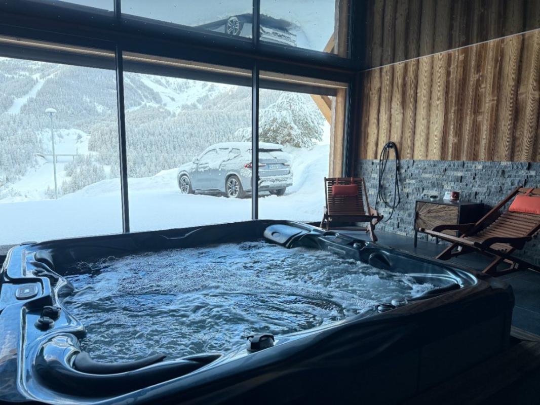 Le chalet a été pensé pour simplifier l'usage au quotidien, avec des prestations de qualité, ascenseur privatif et escalier desservant l'ensemble des niveaux, jacuzzi avec vue unique sur le domaine skiable, ski-room dédié, zone technique et buanderie avec lave-mains et WC.