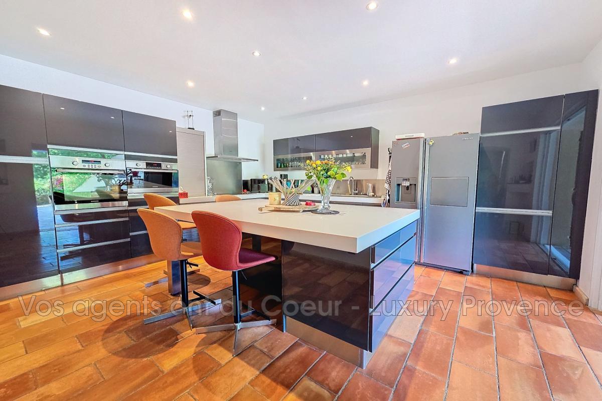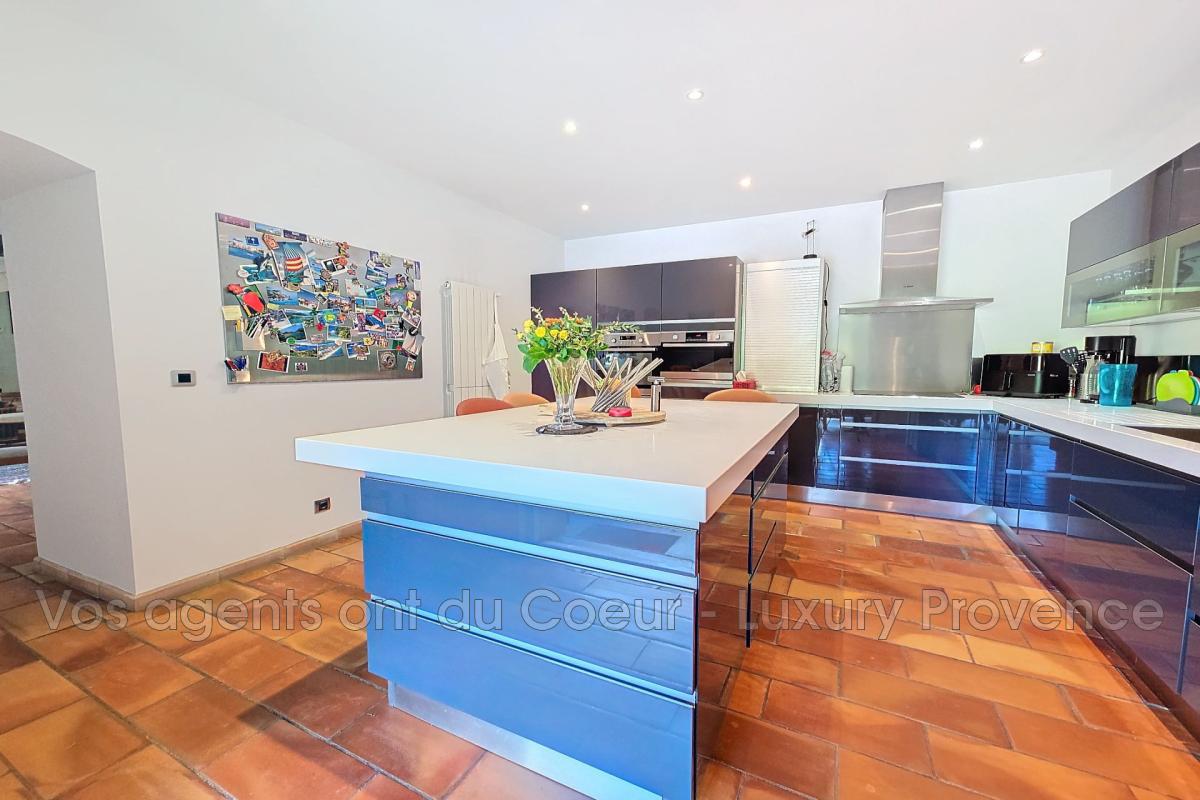 Sa grande cuisine moderne et ouverte par baies à galandage sur la terrasse plein sud couverte, vous permettra de profiter pleinement de cet espace en toutes saisons.
