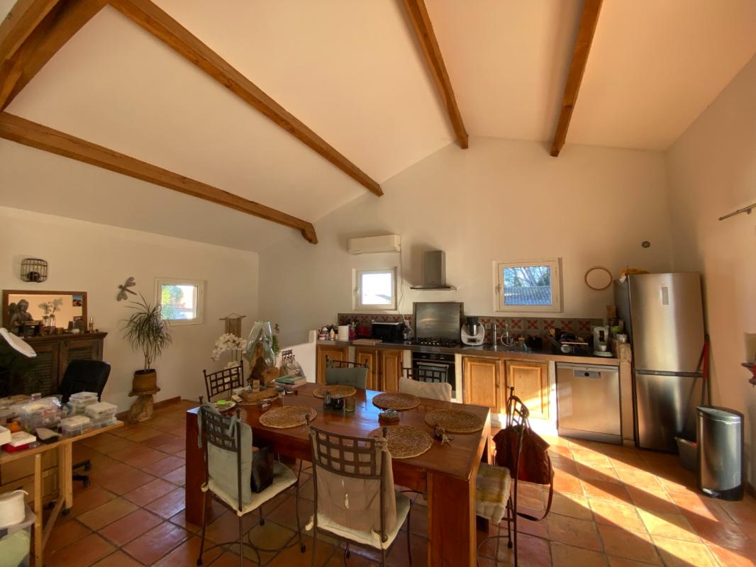 terres cuites artisanales au sol, carreaux de ciment dans la cuisine et la salle de bain, charpente apparente en chêne massif, cheminée, chauffage au sol performant avec chaudière gaz de ville et climatisation dans la pièce de vie.