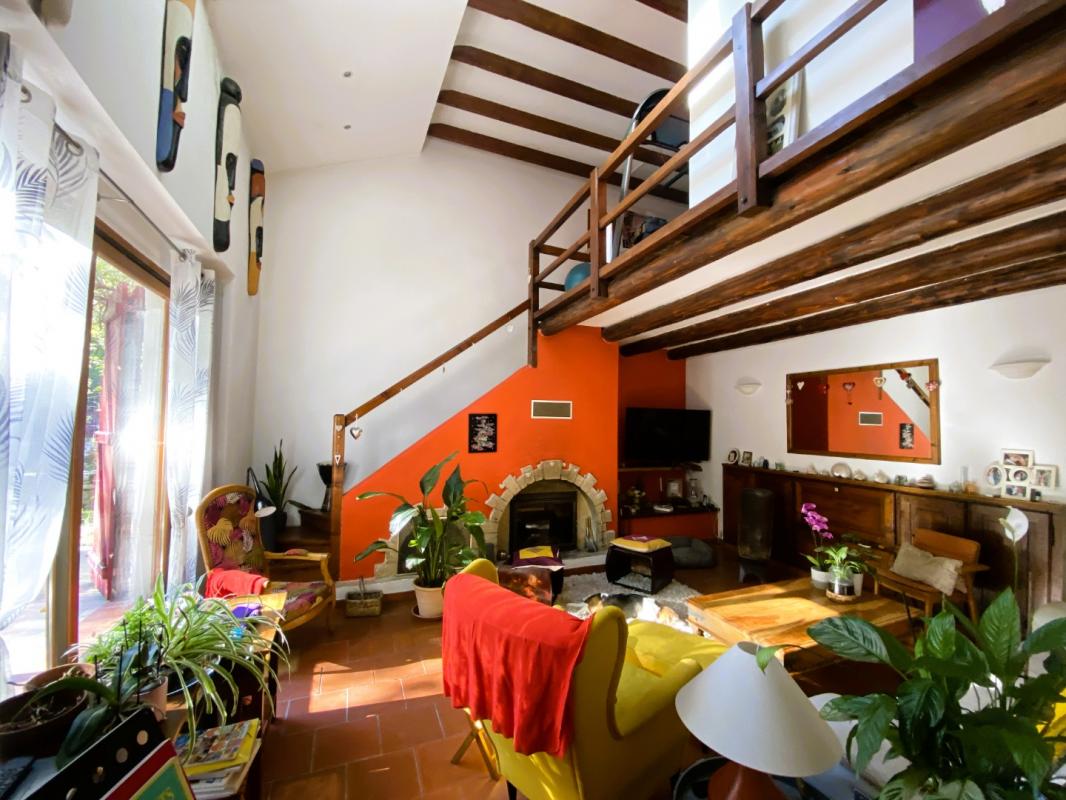 L'entrée dessert un vaste salon lumineux agrémenté d'une cheminée avec insert, ainsi qu'un bureau en mezzanine.