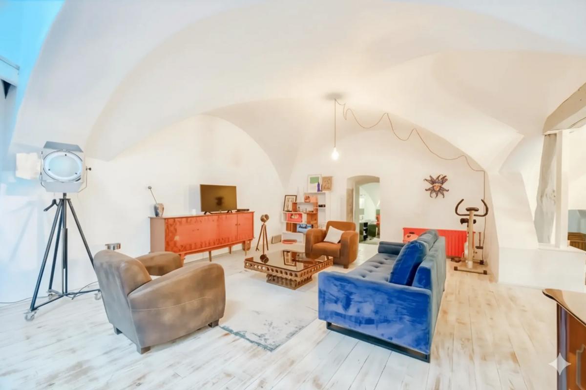 - un vaste séjour voûté de 93m² avec salle à manger, cuisine ouverte, espace bureau/coin nuit et arrière-cuisine,