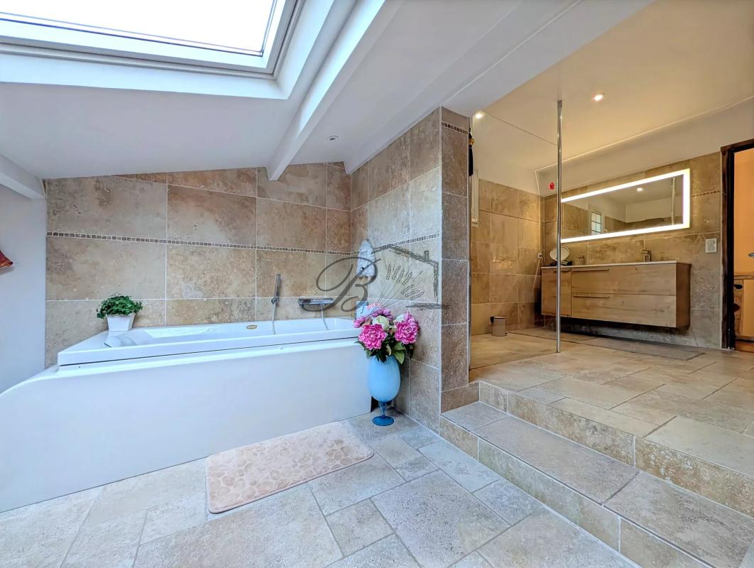 À l'étage, l'espace nuit se compose de trois belles chambres, d'une salle de bain avec une baignoire jacuzzi et une douche à l'italienne, ainsi que de toilettes indépendantes.