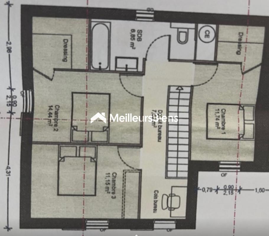 RDC: séjour avec cuisine ouverte, 1 WC. À l'étage, 3 chambres, dressing, 1 WC, salle de bain, coin bureau.