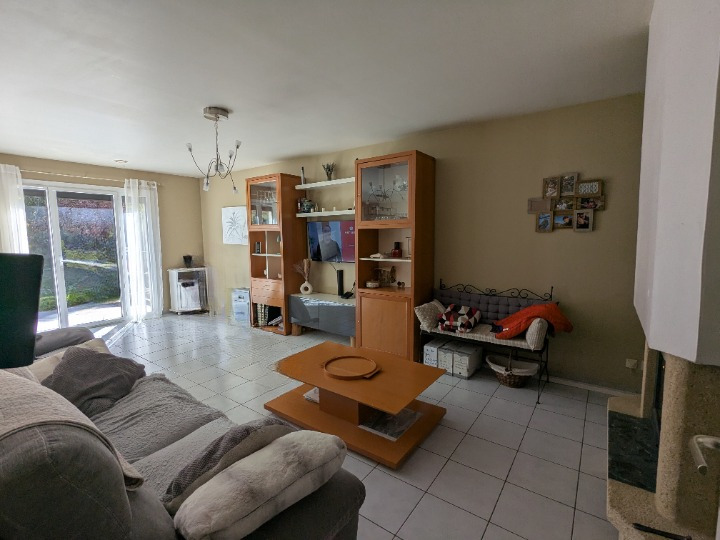 La maison offre une pièce de vie spacieuse et lumineuse, réchauffée par un chauffage au sol et une cheminée, idéale pour les soirées d'hiver. La cuisine, ouverte sur le séjour, est fonctionnelle et parfaitement intégrée à l'espace de vie.