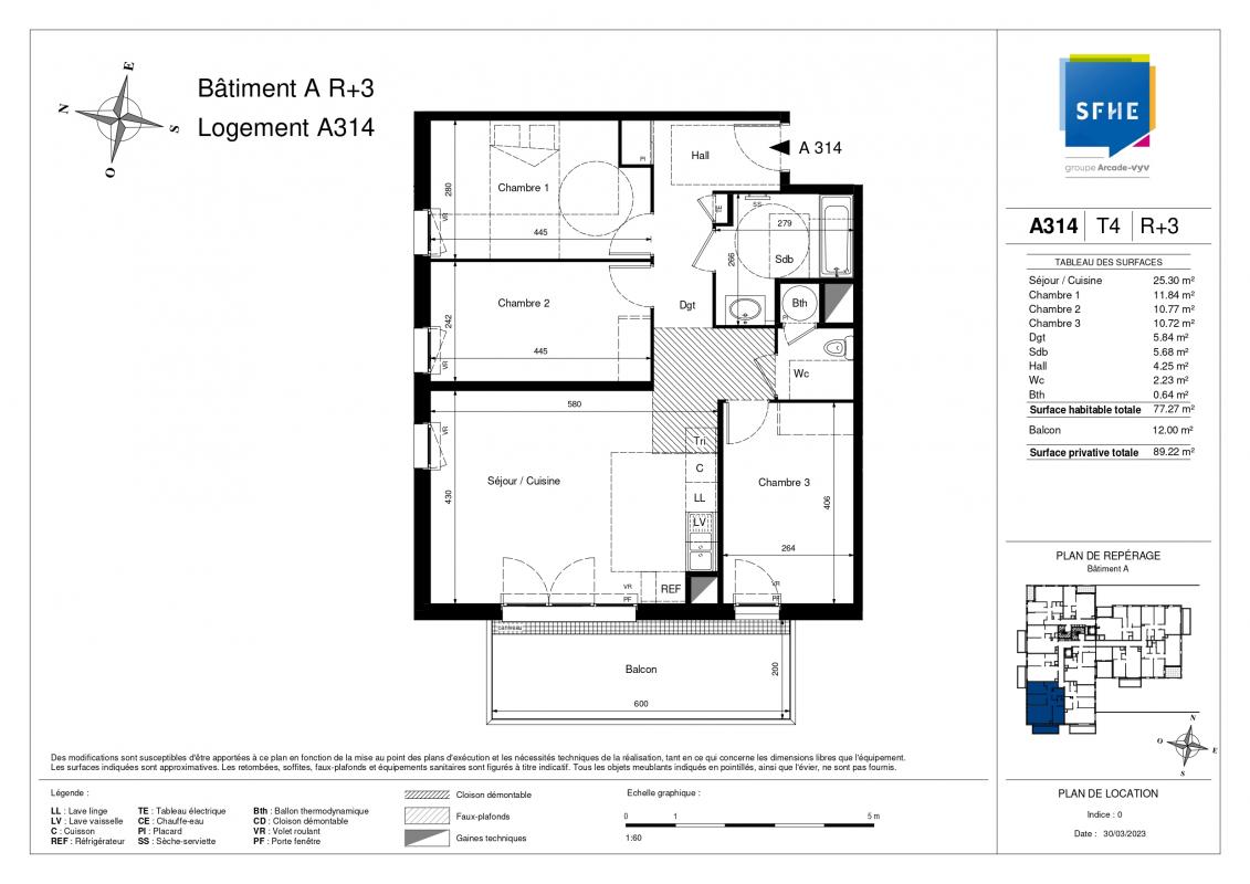 T4 de 77m² au 3ème étage avec ascenseur (immeuble de 8 étage)
