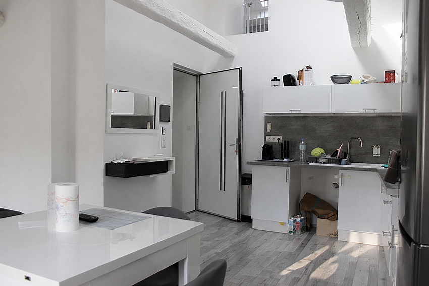 Dès l'entrée, on découvre un vaste espace de vie lumineux exposé plein sud, comprenant un séjour spacieux et une cuisine ouverte entièrement équipée. Les volumes et la circulation fluide donnent immédiatement une sensation d'espace et de liberté, caractéristique des lofts contemporains.